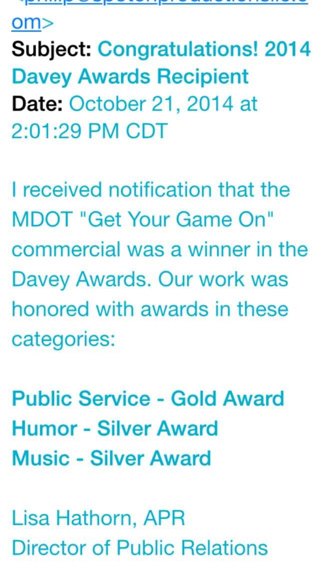 MDOT Commercial featuring 5th Child Voiceover Wins Ad Awards!